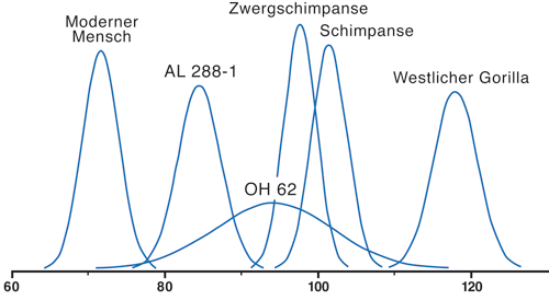 Abb. 3: Stichprobennormalverteilung des Humerofemoralindex von vier modernen Hominoiden (moderner Mensch, Schimpanse, Zwergschimpanse, Westlicher Gorilla) und extrapoliert für A.L. 288-1 (Australopithcus afarensis) sowie mit einer ähnlichen Fehlerverteilung für OH 62 („Homo“ habilis) bestimmt. Nach Korey (1990).