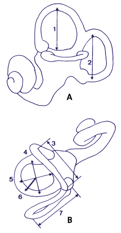 Abb. 5: Das knöcherne Labyrinth mit Ansicht von (A) lateral und (B) superior (nach Spoor et al. 1994). Die drei Bogengänge stehen senkrecht aufeinander. Die relative Größe der Bogengänge ermöglicht Rückschlüsse auf die Körperhaltung. Abkürzungen: (1) Höhe des Ductus semicircularis anterior, (2) Weite des Ductus semicircularis posterior, (3) Weite des Ductus semicircularis anterior, (4) Weite des Ductus semicircularis lateralis, (5) Höhe des Ductus semicircularis lateralis, (6) Radius des Ductus semicircularis lateralis, (7) Höhe des Ductus semicircularis posterior.