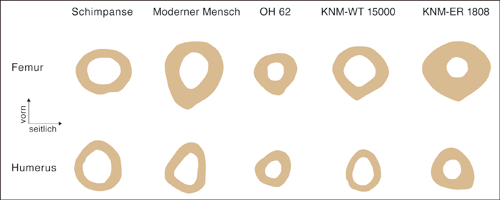 Abb. 4: Repräsentative Querschnitte vom Femur (Oberschenkelknochen) und Humerus (Oberarmknochen) von Schimpansen, modernen Menschen, „Homo“ habilis (OH 62) und Homo erectus (KNM-WT 15000, KNM-ER 1808). Das Femur-Humerus-Stärkenverhältnis von „Homo“ habilis ist dem des Schimpansen und das von Homo erectus dem des modernen Menschen ähnlich. Nach Ruff (2009).