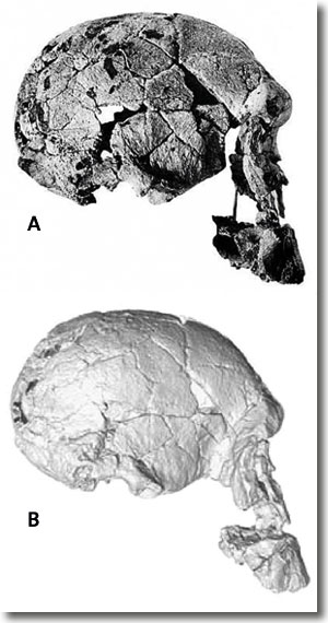 Abb. 6: Rekonstruierter Schädel KNM-ER 1470 (A) nach Leakey (1972) und (B) neu virtuell nach Bromage et al. (2008). Nach der neuen Rekonstruktion zeigt KNM-ER 1470 ein stärker vorstehendes Gesicht und ein etwas kleineres Schädelvolumen. Mit diesen Merkmalen ist KNM-ER 1470 Paranthropus noch ähnlicher als zuvor.