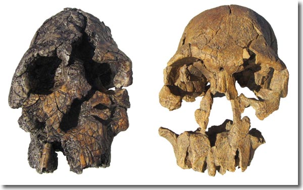 Abb. 7: Kenyanthropus platyops (KNM-WT 40000; links) und „Homo“ rudolfensis (KNM-ER 1470). Der neue Hominine Kenyanthropus platyops (KNM-WT 40000) ähnelt in frappierender Weise (z. B. flaches Gesicht, Form der Augenbrauen) dem schon seit 1972 bekannten „Homo“ rudolfensis zugeordneten Schädel KNM-ER 1470. Es gibt aber auch Unterschiede, insbesondere ist der Hirnschädel von KNM-WT 40000 deutlich kleiner. Wood & Collard (1999) überführten KNM-ER 1470 von Homo in die Gattung Australopithecus. Nach Leakey et al. (2001) sollte er aber eher als Kenyanthropus reklassifiziert werden. (Beide abgebildeten Schädel sind Nachbildungen.)