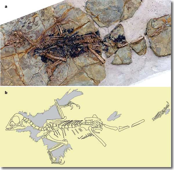 Abb. 1: Holotyp von Xiaotingia zhengi und Strichzeichnung der fossilisierten Skelettelemente. Körperbedeckung ist in b grau dargestellt. Aus Xu et al. (2011), vereinfacht; Abdruck mit freundlicher Genehmigung.