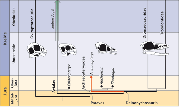 Bislang war Archaeopteryx an der Basis der Avialae (Vögel und verwandte Formen) platziert und damit evolutionstheoretisch als Urvogel interpretierbar. Durch den neuen Fund Xiaotingia verschieben sich jedoch die cladistischen Verwandtschaftsbeziehungen (Abb. 2). Xiaotingia weist deutliche Ähnlichkeiten mit Anchiornis auf, der zu den Deinonychosauria gestellt wird, einer Gruppe der theropoden Dinosaurier, die nicht zu den Vögeln gehört und auch nicht zu den Vogelvorläufern gestellt wird. Aber auch mit Archaeopteryx teilt Xiaotingia so viele gemeinsame Merkmale, dass nun nach den Regeln der Cladistik auch der Urvogel – anders als bisher – ebenfalls zu den Deinonychosauria gestellt werden muss. Die drei Gattungen Anchiornis, Xiaotingia und Archaeopteryx werden innerhalb der Gruppe der Deinonychosauria als Archaeopterygidae zusammengefasst. Die Archaeopterygidae und damit auch Archaeopteryx repräsentieren somit einen Zweig des Stammbaums, der nicht zu den Vögeln führt (vgl. Abb. 2).