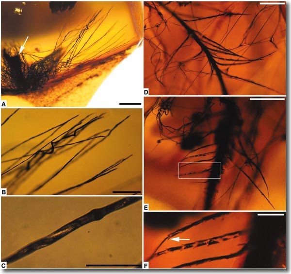 Abb. 2: Federstrahlen mit auffälligen Strukturmerkmalen aus Kanadischem Bernstein; A: Federstrahlen umhüllen einen verdickten Schaft (Rachis; Pfeil zeigt auf Rachis); B: vergrößertes Detail aus A mit spiralisierten Federstrahlen; C: abgeflachte Bereiche und verdickte Knoten; D: einzelnes Federästchen in einem Spinnennetz; E: Federstrahlen nahe der Spitze des Federastes von D; F: einzelner Federstrahl aus (E); das Muster der dunklen Pigmentierung dürfte eine graue bis schwarze Feder bewirken. Die jeweils eingeblendeten Größenangaben betragen: 0,4 mm (A), (B); 0,2 mm (B), (D) und (E); 0,05 mm (C) und (F). Aus McKellar et al. (2011); Abdruck mit freundlicher Genehmigung.