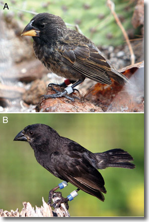 Abb. 2: Eingewandertes Exexmplar der 5. Generation des Mittleren Grundfinks (Geospiza fortis, oben) und ein ortsansässiges Exemplar auf der Insel Daphne Major. Aus Grant & Grant (2009); Abdruck mit freundlicher Genehmigung.