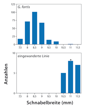 Peter und Rosemary Grant verfolgten das weitere Schicksal dieses Individuums und seiner Nachkommen sieben Generationen lang über einen Zeitraum von 28 Jahren. Der Einwanderer verpaarte sich zunächst mit einem Weibchen von G. fortis, das ebenfalls einige Gene von G. scandens trug. Nach einer schweren Dürre wurde die daraus entstandene Nachkommenpopulation in der vierten Generation auf ein einziges Geschwisterpaar dezimiert. Dieses verpaarte sich, und seine Nachkommen blieben fortpflanzungsmäßig isoliert; d. h. sie pflanzten sich nur noch untereinander fort (Endogamie) und nicht mehr mit anderen auf der Insel lebenden Individuen von G. fortis. Ihr Gesang war weiterhin ungewöhnlich, ebenso ihre Morphologie. Die Variation der Schnabelbreite der auf den Einwanderer zurückgehenden Linie überlappte kaum noch mit der Bandbreite der auf Daphne Major heimischen G. fortis-Vögel (Abb. 3), so dass dieses Merkmal heute fast schon einen diagnostisch verwertbaren Unterschied darstellt (Grant & Grant 2009, 20143). Beispielsweise hatten 20 der 24 ausgemessenen Mitglieder der endogamen Gruppe breitere Schnäbel als alle anderen 462 Vögel von G. fortis auf der Insel seit dem Jahr 2002.