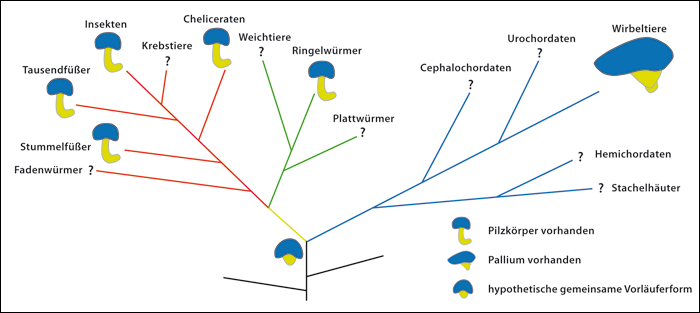Abb. 1: Stammesgeschichtliche Verbreitung des Pilzkörpers und des Palliums (Großhirnrinde) bei den Bilateria („Zweiseitentiere“). Nach Tomer et al. (2010)