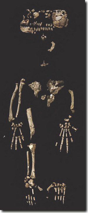 Abb. 1: Das partielle Skelett von Ardipithecus ramidus (Katalognummer ARA-VP-6/500). Man beachte die erstaunlich vollständig erhaltenen Hand- und Fußknochen. (Aus Science 326, 60, Abdruck mit freundlicher Genehmigung).