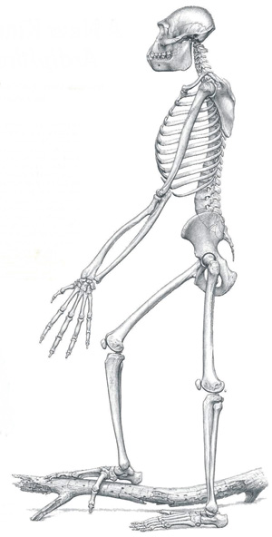 Abb. 2: Rekonstruktion von Ardipithecus, basierend auf dem partiellen Skelett ARA-VP-6/500 und einigen anderen Skelettfragmenten. Die Brustkorbrekonstruktion beruht auf einem Clavicula-Fragment (Schlüsselbein) und der ersten Rippe, der Rest ist angelehnt an A. afarensis, ähnlich wie das stark fragmentierte Becken. Dessen Fragmente wurden mittels CT-Scans zusammen „montiert“. (Aus Science 326, 36, Illustrator: J. H. Matternes, Abdruck mit freundlicher Genehmigung).