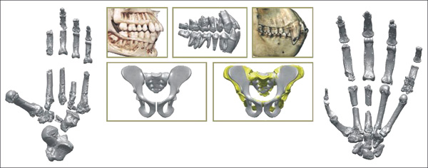 Abb. 3: Der in sich kompakte Fuß (links) konnte flach aufliegen, aber sein großer Zeh stand ähnlich einem Daumen weit ab. Die Hand (rechts) ist flexibel und ohne Zeichen von Knöchelgang. Die Eckzähne (oben Mitte) sind wesentlich kleiner als die der Schimpansen (oben rechts; im Vergleich dazu Mensch links). Die Darmbeinschaufeln von Ardipithecus sind vergleichbar verbreitert wie die von „Lucy“ (Australopithecus afarensis), während der untere Teil ein typisches Affenbecken ist (gelb). (Aus Science 326, 36, Abdruck mit freundlicher Genehmigung)
