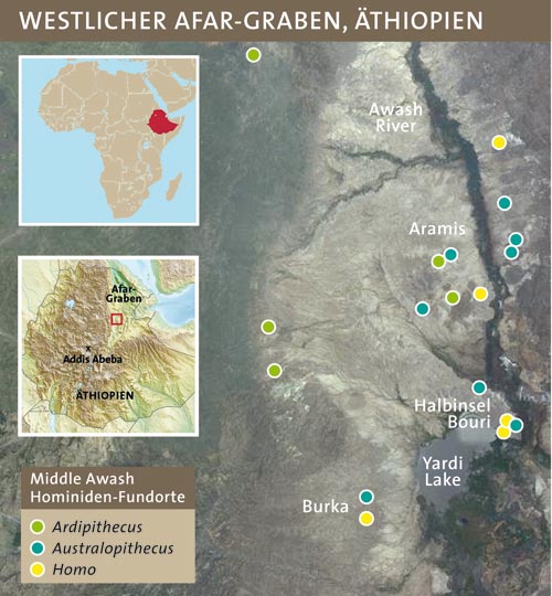 Abb. 4: Ardipithecus stammt aus dem sehr fossil-reichen Afar-Dreieck, Äthiopien, wo mehrere Arten der Gattungen Australopithecus, Ardipithecus und Homo entdeckt wurden.