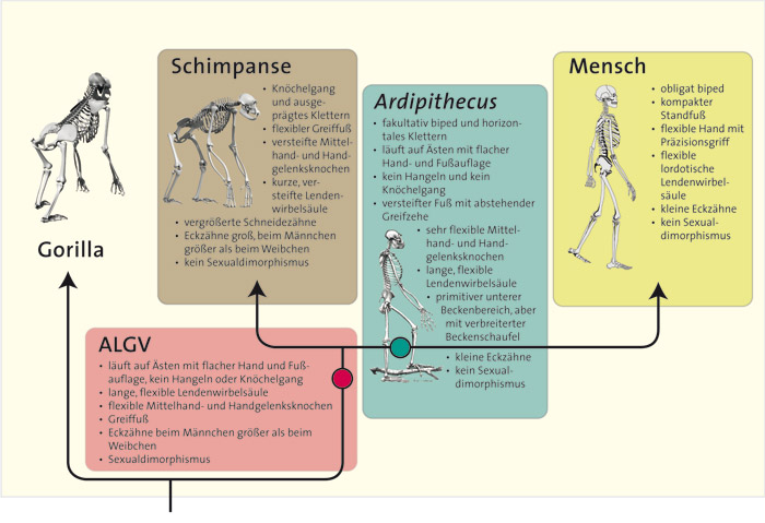 Nach Tim White und Kollegen gäbe es den – wie seit einem halben Jahrhundert durchgängig angenommen – knöchelgehenden schimpansenähnlichen ALGV, der sich langsam vom Savannenboden erhebt, überhaupt nicht (außer „in der Phantasie der anderen Paläanthropologen“). Der „wirkliche“ ALGV sei ein vierfüßig horizontal-kletternder Baumbewohner gewesen, der mit seiner flexiblen lordotischen Wirbelsäule sehr agil war und wie eine Meerkatze mit flachen Hand- und Fußsohlen behände auf den Ästen laufen konnte (Abb. 5). Aus dieser Form habe sich dann durch weitere Körperstammaufrichtung der zweibeinig aufrechte Gang des Ardipithecus entwickelt, den er auf dem Waldboden praktizierte. Die Lordose, die Becken- und Schultergürtelkonstruktion, der relativ kurze und in sich versteifte Standfuß (Lovejoy et al. 2009a) wie auch die Präzisionsgreifhand des Menschen (Lovejoy et al. 2009b) und einiges mehr seien demnach allesamt von diesem eher generalisierten gemeinsamen Vorfahren abzuleiten. Von einer auch nur annähernd schimpansenähnlichen Morphologie ist nichts auszumachen. Das würde bedeuten, dass sich der Schimpanse morphologisch schneller und stärker verändert haben muss als der Mensch in der gleichen Zeit seit der Aufspaltung, weil er vor allem im postkraniellen Skelett eine Reihe von Parallelentwicklungen und Reversionen durchlaufen musste (Hakenhand, Knöchelgang, Lumbalversteifung, Reduktion der Wirbelzahl u. a.).