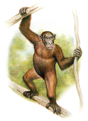 Abb. 6: Einen bipeden Astläufer (Morotopithecus bishopi) gab es schon um 20 MrJ, also über 15 Millionen Jahre vor Ardipithecus. Die Autoren um White sehen in ihm eine konvergente Entwicklung und betrachten ihn und ähnliche Formen als Parallelentwicklung, ohne einen phylogenetischen Zusammenhang herzustellen. (Illustration: Stephen D. Nash & Laura MacLatchy/CI . Copyright 1997. Abdruck mit freundlicher Genehmigung)