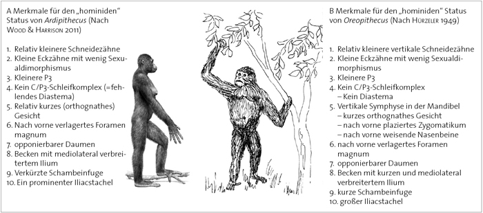Abb. 7: Vor über 60 Jahren wurde Oreopithecus aufgrund von etwa 15 diagnostischen Merkmalen als „Hominide“ eingeführt (Hürzeler 1949), also weit besser begründet als der hominide Status von Ramapithecus über ein Jahrzehnt später. Hürzelers Liste ähnelt verblüffend derjenigen, die 2009 für den „hominiden“ Status von Ardipithecus angeführt wurde (es wurden die 10 wichtigsten ausgewählt) (nach Wood 2011, verändert). Inzwischen werden die „hominiden“ Merkmale von O. entsprechend der herrschenden Vorstellung als Parallelentwicklung interpretiert. Ob dieses Schicksal auch Ardipithecus zuteil wird? (Rekonstruktion von Oreopithecus nach Köhler & Moyà-Solà 1997; von Ardipithecus aus Science 326, S. 1598, Abdruck mit Genehmigung, Illustrator: J. H. Matternes)