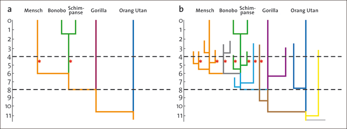 Abb. 8: Je nach Stammbaumvorstellung gibt es unterschiedlich viele phylogenetische Positionsmöglichkeiten für Ardipithecus: Die lineare Vorstellung (a, „clean view“), mit der White et al. argumentieren, ist heute eher überholt: der 4,4 MrJ alte Ardipithecus kann hier nur ein Vorfahre des Menschen oder des Schimpansen sein. Nach b, dem „unordentlichen“ Stammbaum („messy view“) kann es eine Reihe verschiedener Möglichkeiten für seine phylogenetische Position geben (Sterne).