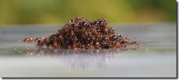Menschen erarbeiten für verschiedenste Katastrophenszenarien mehr oder weniger gute Pläne, um Schäden so weit wie möglich einzugrenzen. Der Ameisen-Katastrophenplan ist nahezu perfekt. Bei einer Überflutung wird innerhalb kürzester Zeit ein lebendes, intelligent gestaltetes Rettungsfloß zur Evakuierung gebaut, auf dem neben der Besatzung auch Königin und Eier transportiert werden. Das Ameisenvolk bildet wie nach Anleitung ein wasserabweisendes Ameisengewebe mit niedrigerer Dichte als Wasser. Das Ergebnis ist ein flexibles, schwimmendes Rettungsfloß, das Wind und Wellen trotzt! Jedes Ameisenindividuum weiß offenbar, worauf es ankommt und sucht sich seinen Platz innerhalb der mehrschichtigen Struktur. Eventuell entstandene Lücken werden selbständig repariert. Das biegsame Ameisengewebe verhält sich wie eine zähflüssige Masse und wird von den einzelnen Ameisen-„Bausteinen“ mit einer Kraft, die dem 400-fachen ihres Körpergewichtes entspricht, zusammengehalten. Die Ameisen agieren hier als Konstrukteure, Transporteure und Bauarbeiter und sind zugleich das Baumaterial. Wenn nötig können die „unbesiegten“ Ameisen in dieser Rettungs-Formation tagelang ausharren, bis sie rettendes Ufer erreichen.