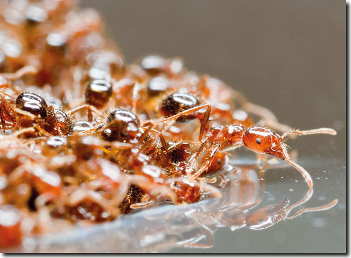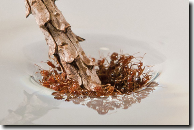 Die etwa 3 bis 6 Millimeter großen Feuerameisen sind aber auch zu Wasser eine Schlagzeile wert. Sie bedienen sich einer außergewöhnlichen Strategie, um Überflutungen zu überleben oder um mit einem ganzen Volk per Flussfahrt umzusiedeln: Sie schließen sich zu einem lebenden Rettungsfloß zusammen! Dieses Phänomen ist Forschern zwar seit langem bekannt, jedoch blieb es bislang ein Rätsel, wie es den lebenden Ameisenflößen gelingt, unbeschadet auf dem Wasser zu treiben (Abb. 1). Bereits in dem 1830 erschienen Buch „Insect Architecture“1 wurde von diesem außergewöhnlichen Evakuierungsplan der Ameisen berichtet.