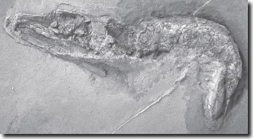 Abb. 1: Fossil der neu entdeckten Garnelen-Art Aciculopoda mapesi n. sp. (Aus Feldmann & Schweitzer 2010, Abdruck mit freundlicher Genehmigung)