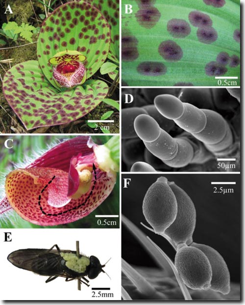 So haben jetzt chinesische und amerikanische Wissenschaftler (Ren et al. 2011) festgestellt, dass bei der mit dem heimischen Frauenschuh verwandten Art Cypripedium fargesii aus Südwestchina (Abb. 1 A) eine sonst bei Blütenpflanzen als Bestäuber nicht bekannte Fliegenart in besonderer Weise angelockt wird, um ohne Gegenleistung die Bestäubung durchzuführen. Die entsprechende, zu den Tummel- oder Pilzfliegen (Platypezidae) zählende Art aus der Gattung Agathomyia (Abb. 1 E) ernährt sich wie die meisten Vertreter dieser Familie von Mikropilzen, die parasitisch auf Laubblättern leben, hier speziell einem Schimmelpilz der Gattung Cladosporium. Die Orchidee imitiert die Struktur und die typische Schwarzfärbung dieses Pilzes durch schwarz behaarte Flecken auf der Blattoberfläche (Abb. 1 B, D) bei gleichzeitiger Abgabe von Duftmolekülen durch die Blüte. Diese erinnern an den Geruch faulender Blätter und sind in sehr ähnlicher Form auch von Kulturen des Pilzes bekannt. Merkwürdigerweise sehen außerdem die mehrzelligen Haare in den Blattflecken (Abb. 1 D) sehr ähnlich aus wie die Konidiosporen abgebenden Pilzfäden von Cladosporium (Abb. 1 F). Die auf diese Weise angelockten Fliegen gelangen schließlich in die Blüte. Genauso wie die Bestäuber unseres heimischen Frauenschuhs (Cypripedium calceolus) müssen sich die Fliegen, um wieder herauszukommen, durch die sackförmige Ausstülpung der Blüte hindurch zwängen und führen dabei die Bestäubung durch. Nektar als potentielle „Belohnung“ wird nicht geboten, und der Pollen landet in Form der für Orchideen typischen Gesamtpakete (Pollinien) auf dem Rücken des Insektes (Abb. 1 E).