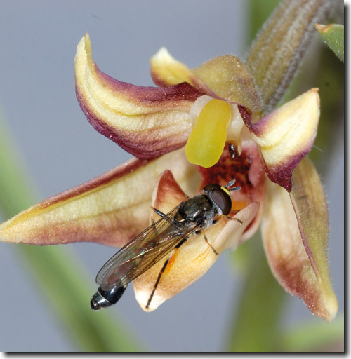 Abb. 1: Blüte der Orchidee Epipactis veratrifolia. Die Schwebfliege (hier Ischiodon aegyptus) hat sich durch Duftstoffe anlocken lassen, die ihr vorgaukelten, in der Nähe gäbe es Blattläuse als ideale Nahrung für ihre schlüpfenden Larven. Entsprechend legt sie ihre Eier in der Blüte ab und bestäubt diese dabei. Foto: J. Stökl, MPI für chemische Ökologie, Jena, Abdruck mit freundlicher Genehmigung.