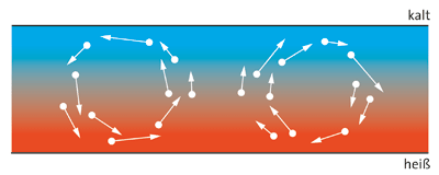 • Ist die Temperaturdifferenz zwischen den beiden Platten niedrig, so findet in der Flüssigkeit lediglich Wärmeleitung statt. Dies bedeutet, dass die Flüssigkeitsmoleküle sich völlig ungeordnet bewegen, es sind keine räumlichen Strukturen erkennbar.