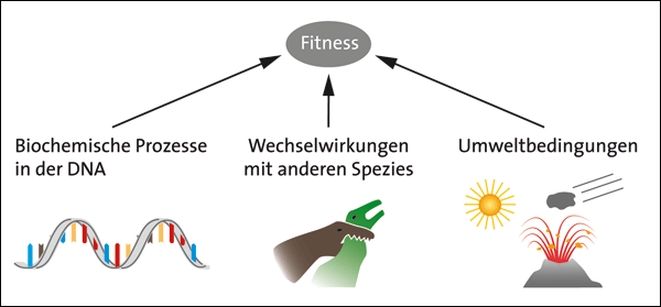 Eine wichtige Größe in den meisten mathematischen Modellen zur Evolution ist die Fitness. Dabei handelt es sich um die durchschnittliche Zahl an überlebensfähigen Nachkommen, die ein Lebewesen zeugt. Diese Größe hängt in der Realität von vielen verschiedenen Faktoren ab5 (Abb. 2):