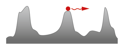 Abb. 3: Bewegung eines Teilchens in einer Energie-Landschaft, beispielsweise in einem Festkörper. Diese kann durch die selben Gleichungen beschrieben werden wie Mutation und Selektion in einer Fitness-Landschaft. Die Energie des Teilchens entspricht dabei der Fitness eines Genotyps, die Vorzeichen sind jedoch umkehrt: Ein „Berg“ in einer Energie-Landschaft entspricht einem „Tal“ in einer Fitness-Landschaft.