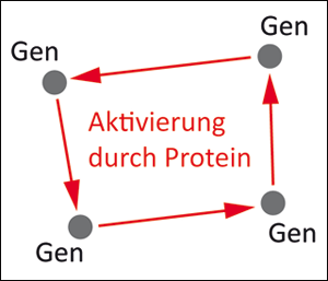 In einer Zelle werden in der Regel nicht alle vorhandenen Gene „übersetzt“. Stattdessen kann die Synthese der verschiedenen Proteine aktiviert und deaktiviert werden. Bei der Aktivierung und Deaktivierung der Gene sind Proteine beteiligt, für deren Synthese wiederum andere Gene erforderlich sind (Abb. 4). Wenn ein Gen aktiviert und somit das zugehörige Protein synthetisiert wird, dann kann dies die Aktivierung eines weiteren Gens zur Folge haben. Dadurch besteht zwischen unterschiedlichen Genen eine Abhängigkeit, die als Wechselwirkung interpretiert werden kann. Aus einem abstrahierten Blickwinkel können die Gene als eigenständige Komponenten betrachtet werden, die nach bestimmten Regeln miteinander kommunizieren.