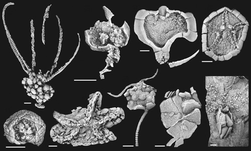 Abb. 1: Verschiedene Stachelhäuter-Gruppen (Echinodermen) aus dem Mittelkambrium Spaniens. Linie jeweils 2 mm. (Aus Zamora 2010, Abdruck mit freundlicher Genehmigung)