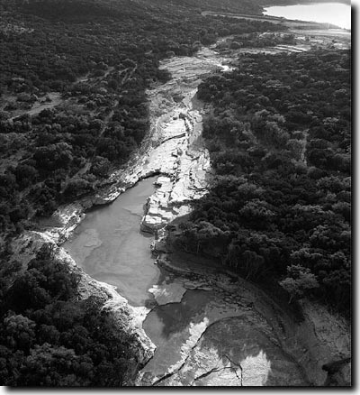 Abb. 1: Luftaufnahme des schnell und gewaltsam erodierten Canyon Lake Gorge bei der Stadt San Antonio in Mitteltexas (Comal County), USA nach einer Sturzflut im Sommer 2002. (Gorge Preservation Society, HYPERLINK www.canyongorge.org)