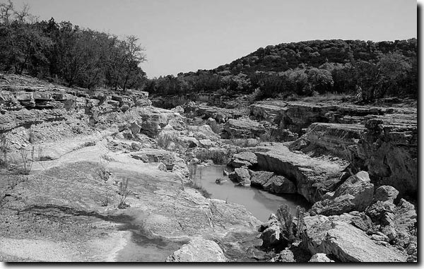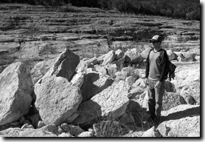 3. Auffällige Strukturen nach der Sturzflut. Die durch die hydraulischen Wirbel der Sturzflut (vergleichbar mit überdimensionalen Strudeln wie man sie beim Ablauf eines Beckens beobachten kann) herausgemeißelten Felsbrocken wurden mitgerissen und nach Abklingen der heftigen Strömung im Unterlauf des Canyons dachziegelartig abgelagert (Imbrikation; Abb. 5).Das Herausreißen solch großer Brocken aus dem Festgestein war vor allem dort möglich, wo es bereits durch Klüfte und Störungen brüchig war. Die Form des Canyons bildete sich in Abhängigkeit vom anstehenden Gestein: An den Stellen, wo das härtere Kalkgestein (Kreidekalk mit Dolomiten und Mergeln der Glen Rose Formation) aus dem Untergrund herausgerissen wurde, entstanden Wasserfälle.