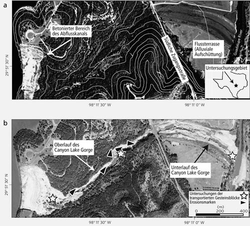 Abb. 3: Nah-Infrarot-Luftaufnahmen vom Canyon Lake Gorge mit digitaler Auflösung im 1-m-Bereich. a 1995 vor der Sturzflut. Neben dem Canyon Lake sind der kurze betonierte Abflusskanal, die südliche Zugangsstraße, das mit Vegetation bewachsene Tal, die alluviale Aufschüttung und der Guadelupe Fluss zu sehen. Die weißen 10m-Höhenlinien zeigen die Morphologie des Gebiets. b 2007 nach dem Sturzflut-Ereignis. Die markierten Stellen im neuen Canyon Lake Gorge wurden geologisch auf Erosionsmarken (Abrasion, schwarze Pfeile) und sedimentologisch mittels Probennahmen nach Korngrößen-, Block- und Geröll-Analysen untersucht (auf der Karte sind die Untersuchungen der transportierten Blöcke mit einem Stern markiert). Aus Lamb & Fonstad 2010 anhand Unterlagen des National Geodetic Survey und US Geological Survey (© Nature Geoscience).