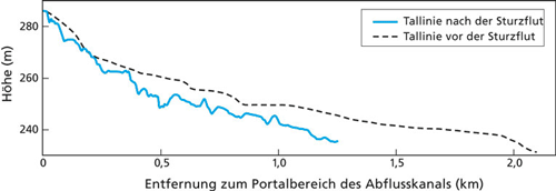 Abb. 4: Längsprofil des Talgefälles entlang der längsten Tallinie vor (gestrichelt) und nach (durchgezogene Linie) der Sturzflut (Auflösung im 1-m-Bereich; nach Lamb & Fonstad 2010 anhand Unterlagen von der Guadelupe Blanco River Authority, Texas).