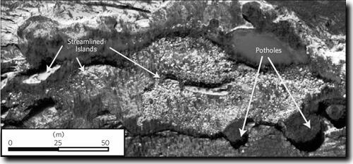 Abb. 6: Die gewaltige Sturzflut (Fließrichtung von links nach rechts) riss Blöcke aus dem Gesteinsverband heraus, diese meißelten dann aus dem anstehenden Gestein tiefe Einschnitte in Form von Wasserfällen (bis 12 m Höhe) heraus. Am Fuß dieser Wasserfälle war die Erosionsleistung durch das Herausschlagen der Gesteinsblöcke besonders hoch, so dass Strudellöcher (Potholes) mit einem Durchmesser von 10-25 m ausgekerbt wurden, die heute als Tümpel mit Wasser gefüllt sind. Das Foto zeigt außerdem stromlinienförmig aufgeschüttete Schuttinseln, die die ehemalige Strömung während und nach dem Transport durch die Schlammströme zeigen. Luftbild aus Lamb & Fonstad 2010, Vorlage vom US Geological Survey, © Nature Geoscience.