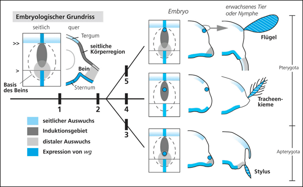 Abb. 2: Embryologischer Grundriss der Segmente der Insekten und ein Modell zur Evolution des Flügels. Links: Seitliche Sicht und Querschnitt eines generalisierten Segments, Expression von wg und Unterteilung in drei Regionen. Rechts: Vorgeschlagenes Szenario der Evolution des Insektenflügels. (1) Etablierung des Segment-Grundplans mit wg-freier seitlicher Region, (2) Erwerb des wg-vg-Moduls zur Induktion der rückenseitigen Abzweigung des Auswuchses, (3) Bildung des Stylus, (4) Bildung der Tracheenkiemen, (5) Bildung des Flügels. Die Position der induktiven wg-vg-Expression variierte in der seitlichen Region (evolutionäre Drift). Eine erfolgreiche Kombination beider Module soll die schnelle Entstehung eines flächigen Flügel-Auswuchses ermöglicht haben. Näheres im Text. Nach Niwa et al. (2010)