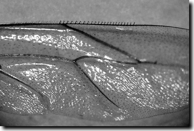 Abb. 3: Hamuli des linken Hinterflügels der Honigbiene Apis mellifera (von ventral) – eine ausgeklügelte Arretierungsvorrichtung. Foto: Winfried Borlinghaus