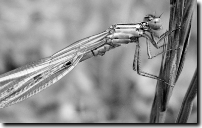 Abb. 4: Relativ frisch geschlüpftes Weibchen der Becher-Azurjungfer (Enallagma cyathigerum). Ein einziges Libellenflügelgelenk mit der entsprechenden Muskulatur versehen ist dermaßen komplex aufgebaut, dass umfangreiche wissenschaftliche Arbeit erforderlich ist, um allein die Freiheitsgrade des möglichen Flügel- Bewegungsablaufs technisch zu verstehen, die Kraftübertragung mathematisch zu beschreiben und im Modell umzusetzen. Foto: Winfried Borlinghaus