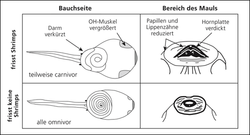 Abb. 1: Vergleich des Baus von Kaulquappen der Gattung Spea, die Süßwassergarnelen (Shripms) fressen (oben) und solchen, die sich als Allesfresser ernähren (unten). (Nach Pfennig & Murphy 2000)