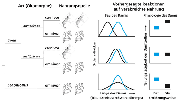 Abb. 2: Links: Cladogramm und Ernährungsweise der im Text beschriebenen Arten. Rechts: Reaktionen der Darmlänge und der Darmphysiologie bei unterschiedlicher Ernährung. Näheres im Text. (Nach Ledon-Rettig et al. 2008)