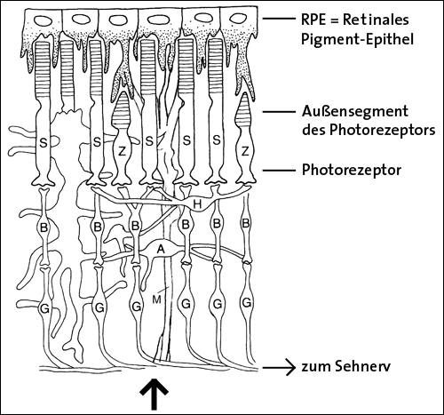 Abb. 1: Schematisches Diagramm einer Wirbeltier-Retina inklusive der Lage der neu entdeckten Müller-Zelle. Der dicke Pfeil zeigt die Richtung des einfallenden Lichts an. A Amakrine Zelle, B Biploar-Zelle, G Ganglienzelle, H Horizontalzelle, M Müller-Zelle, S Stäbchen, Z Zapfen. (Nach Adler & Farber 1986 und Franze et al. 2007)