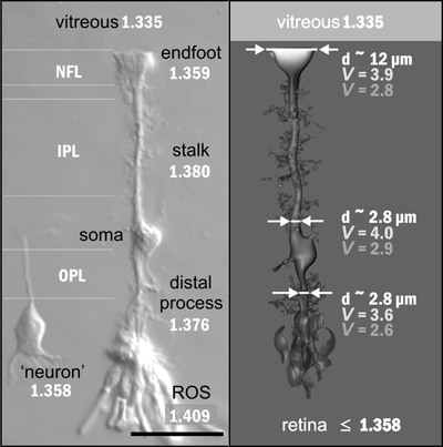 Abb. 2: Aufnahme einer Müller-Zelle (vom Schwein) mittels Interferenz-Kontrast-Mikroskopie (links) und als schematische Darstellung (rechts). Aus Franze et al. (2007), © 2007 National Academy of Sciences, USA. Die Müller-Zellen verlaufen radial zur Netzhaut und durchziehen diese in ihrer gesamten Breite. Die Fortsätze dieses besonderen Typs von Gliazellen dienen als Lichtleiter, die einen nahezu verlust- und verzerrungsfreien Transport des Lichts zu den äußeren Segmenten (ROS) der optischen Sinneszellen garantieren. Rechts: Einzelne Zellschichten (NFL, IPL, OPL) der Netzhaut mit ihrem jeweiligen Brechungsindex. Links: Brechungsindices (V-Wert) für rotes und blaues Licht in unterschiedlichen Abschnitten eines Fortsatzes der Müller-Zelle. Trotz der unterschiedlichen V-Werte und der divergierenden Durchmesser (d) in den einzelnen Bereichen des Fortsatzes erfolgt der Lichttransport ohne Kapazitätsverluste. vitreus: Glaskörper (dem Licht zugewandte Seite der Retina). Messbalken: 25 Mikrometer.