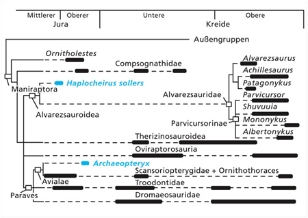 Ja – insofern, als ein Vertreter aus der Gruppe der Maniraptora in älteren Schichtfolgen gefunden wurde. In dieser Gruppe werden am ehesten die Vogelvorfahren gesucht. Die Beschreiber des Fundes, Choiniere et al. (2010), stellen Haplocheirus jedoch nicht in die verwandtschaftliche Nähe von Archaeopteryx und der Linie, die zu den Vögeln führen soll (Abb. 2). Die zum Graben spezialisierten Vorderbeine, die auch Haplocheirus besaß, sind zudem nicht gerade eine passende Vorläuferstruktur für Flügel. Als Form, die zu den Vögeln überleitet, kann Haplocheirus also nicht interpretiert werden. Ungewöhnlich ist auch die Größe. Der Schwanz ist zwar nicht erhalten, aber aus dem Kopf und Rumpf kann eine Körpergröße von 190-230 cm geschlossen werden, womit diese Gattung die größte unter den Alvarezsauriden ist. Daraus ergibt sich in dieser Gruppe ein phylogenetischer Trend hin zu kleineren Formen, was unter Dinosauriern ungewöhnlich ist.