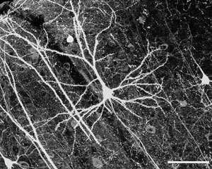Abb. 1: Mikroskopische Aufnahme eines Pyramiden-Neurons der Maus (Zerebraler Cortex). Maßstabsbalken: 100 µm. (PLoS Biology Vol. 4, No. 2, e29. doi:10.1371/journal.pbio.0040029, Figure 6f; Creative Commons Attribution 2.5 license).