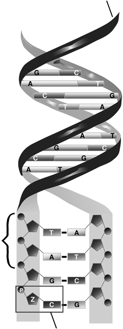 Abb. 1: Aufbau der DNS. Oben die Doppelhelix mit den vier DNA-Grundbausteinen (Basen) Adenin (A), Guanin (G), Cytoson (C) und Thymin (T); unten genauere Darstellung der Basen. Z = Zucker Desoxyribose, P Phosphatrest. Je zwei Basen passen genau zueinander und sind daher „komplementär“. Ein Triplett steht für eine Aminosäure.