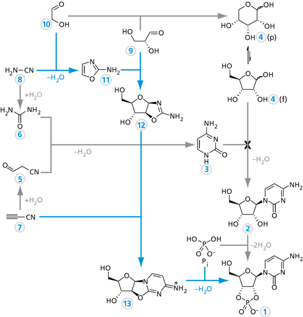 Bei der Synthese von Powner et al. wird als Hauptprodukt Cytidin als 2’,3’-Cyclophosphat erhalten und zwar ohne dass während der einzelnen Syntheseschritte Ribose oder Pyrimidin-Stickstoffheterocyclen entstehen würden (s. Abb. 2; blaue Reaktionsabfolge). Zunächst wurde nach einer plausiblen präbiotischen Synthese für das 2-Amino-Oxazol (11 in Abb. 2) gesucht. Diese Substanz war in vorherigen Untersuchungen (Anastasi et al. 2006) als aussichtsreiche Zwischenverbindung erkannt worden. Bei der Reaktion von Cyanamid (8) und Glycolaldehyd (10) in Phosphatpuffer (1M, pH 7,0) konnten die Autoren die Verbindung (11) in 75 % Ausbeute isolieren. Nach Vorversuchen konnten Powner et al. im nächsten Reaktionsschritt das Amino-Oxazolin (12) als Hauptprodukt erhalten, wenn sie (11) als Rohprodukt (d.h. nach der vorgenannten Reaktion ohne nachfolgende Reinigungsschritte) in Gegenwart von Phosphat mit Glycerinaldehyd (9) reagieren ließen. Die Verbindung (12) wird allerdings erst nach selektiver Kristallisation eines weiteren Produkts (eines Diastereomeren Ribose-Amino-Oxazolins) Hauptprodukt in der verbleibenden Lösung. Jetzt muss in einem nächsten Schritt der bereits angelegte N-Heterocyclus komplettiert werden. Dies erreichten die Autoren durch eine Anlagerung von Cyanoacetylen (7) an (12). Systematische Untersuchungen zeigten, dass bei dieser Reaktion die Kontrolle des pH-Wertes von großer Bedeutung ist. In Phosphatpuffer bei pH 6,5 konnte das Arabinose-Anhydronukleosid (13) mit 92 % Ausbeute isoliert werden. Dieses kann jetzt in das Zielmolekül, Cytidin (1) umgelagert werden und zwar durch Phosporylierung. Bei trockener (ohne Lösungsmittel) Reaktion (13) mit Pyrophosphat in Harnstoff (6) erhält man (1) mit 32% Ausbeute. Erhitzt man alternativ (13) mit Phosphat und Harnstoff in Formamid, erhält man (1) mit 46%. Um Cytidin-2´,3´cyclophosphat von den Nebenprodukten abzutrennen zeigte sich die Bestrahlung des Rohprodukts als sehr effektiv. Nach intensiver Bestrahlung mit UV-Licht (254 nm) in Phosphatpuffer bei pH 6,5 werden die anderen Produkte (Pyrimidin-Nukleoside und Nukleotide) zerstört und man erhält Cytidin 2´,3´cyclophosphat und Uridin-2´,3´-cyclophosphat in 43 % bzw. 42 % Ausbeute.
