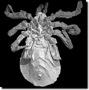 [Garwood R, Dunlop JA & Sutton MD (2009) High-fidelity X-ray micro-tomography reconstruction of siderite-hosted Carboniferous arachnids. Biol. Lett. doi: 10.1098/rsbl. 2009.0464; Penney D, Dierick M, Cnudde V, Masschaele B, Vlassenbroeck J, Hoorebeke van L & Jakobs P (2007) First fossil Micropholcommatidae (Araneae), imaged in Eocene Paris amber using X-ray computed tomography. Zootaxa 1623, 47-53.]