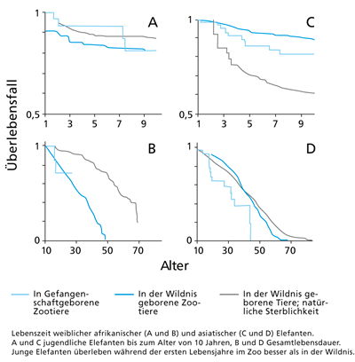 Abb. 2: Überleben von Jung- und Erwachsenentieren beider Elefantenarten in Wildnis und Gefangenschaft.