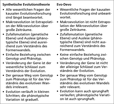 Tab. 1: Gegensätzliche Positionen von Neo-Darwinismus (Synthetische Evolutionstheorie) und Evo-Devo. (Nach Amundson 2005, 166; Arthur 2000, 55; Bateman & DiMichele 2002, 111; Charlesworth 1982; Cronk 2002, 11; Salazar-Ciudad & Jernvall 2005, 619; Stotz 2005, 349, u.v.a.)