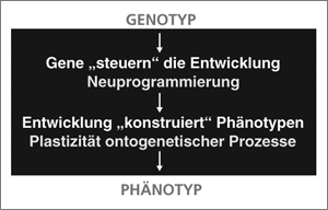 Abb. 1: Für die Synthetische Evolutionstheorie war die Ontogenese weitgehend eine Black Box. Deren Inhalt versucht der Evo-Devo-Ansatz für die Erklärung evolutiver Neuheiten nutzbar zu machen. Genotyp = Summe der Erbfaktoren, Phänotyp = Erscheinungsbild.