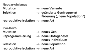 Tab. 2: Klassische neodarwinistische 3-Stadien-Sicht vom Ursprung der Arten und 4-Stadien-Verständnis im Sinne von Evo-Devo. Nach Arthur (2000).